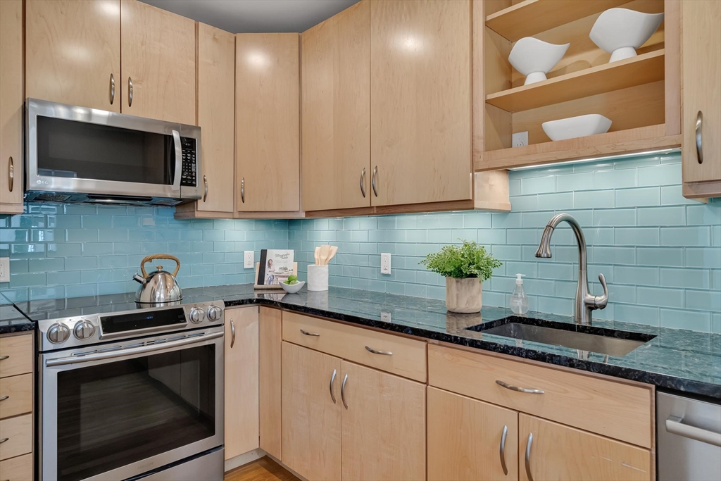 Delightful, spacious and sunny penthouse unit on tree-line side street in Brighton's Aberdeen Historic District abutting Brookline. Skylit main living area with tall ceilings and open plan. Wood floors. Living room, with 14-foot cathedral ceilings offers wood burning fireplace and sliding doors to private deck. 10-year-old kitchen and bathroom are nicely appointed and well laid-out. Bathroom is skylit as well. Both bedrooms are large and have wood floors and good light/views. Bonus loft (15x12) space offers excellent room for a guest or office. Control your own heat and air conditioning. One assigned parking space, plus guest parking available. Building is pet friendly. Association is in good condition physically and financially. Convenient to Washington Square, Cleveland Circle, Chestnut Hill Reservoir Greenline MBTA B, C, D lines. A rare and beautiful offering.