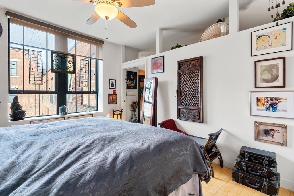 Industrial chic loft, set in the American Brewery Lofts near Longwood Medical, features 9' high ceilings & overlooks a fantastic interior courtyard. 1200 sqft 1 bedroom loft offers an open floor plan of combined living/dining space with oversized windows that view into the courtyard. A built-out bedroom overlooks the courtyard & features two custom closets maximizing storage space. Bamboo flooring, shiplap, kitchen with stainless steel appliances, extra-large custom media cabinet & custom closets finish this loft. Other outstanding amenities include professionally managed elevator building, 2 garage parking (#21&22), stackable in-unit laundry, central air-conditioning, 2 extra basement storage units (#007&49), fitness room & bike rack. The building shares a fantastic urban 5,000 square foot landscaped interior courtyard with gas grill & is conveniently located just 2 blocks from the Heath Street Green Line, 39 bus, minutes to Longwood Medical, Brookline Village, JP center, Whole Foods.