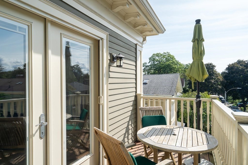 Delightful and sunny, top unit on tree-lined side street near the High School. Flexible floor plan with 4 to 5 bedrooms and 9-foot ceilings. Beautiful old-world detail and moldings. Wood floors throughout. Fireplaced living room leads to music room which has exterior access to a South-facing porch. Dining room has original built in china-cabinet. Main bathroom has original claw foot tub. The kitchen is eat-in with antique porcelain sink, and cherry cabinets, and large walk-in pantry. Significant storage in the attic and basement. Laundry in the basement, but there are options for bring it in to the unit. Mini-split AC units. Solar panels on the roof almost eliminate your electric bill. Private electric car charger at parking space in rear. Only a few blocks to Brookline High and MBTA "D" Green Line and Brookline Village. Convenient to Washington Square and Coolidge Corner as well. Well located unit in nice condition. A rare find!
