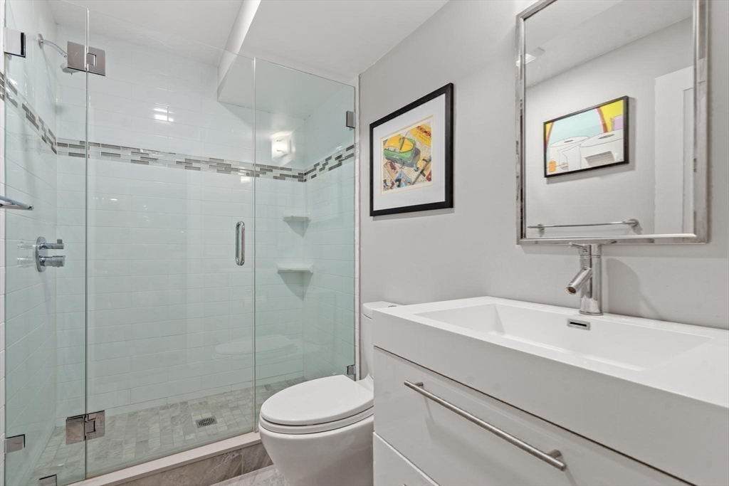 Located on a quiet side street near Needham Center, this sun-splashed townhouse at the "Sail Lofts" (built in 2015) offers 4-bedrooms, 4 bathrooms, fantastic layout, and private fenced yard. First floor features a beautiful kitchen with white shaker cabinets and stainless steel Jenn-Air appliances, and a stunning open-layout dining room / living room with dramatic cathedral ceilings, large windows, and access to private yard. Also on first floor are a bedroom with en suite full bathroom, bonus room which could serve as mudroom or pantry, and washer/dryer. Second floor offers large primary suite with walk-in closet and elegant full bathroom, and a second bedroom with en suite bathroom. Lower level has bedroom, full bathroom, family room, office, and climate-controlled wine cellar. Private outdoor space includes patio, fenced yard and storage shed. Two assigned parking spaces, plus guest parking. Great "walk score" - near shops, restaurants, 2 train stations, schools, parks. A true gem!